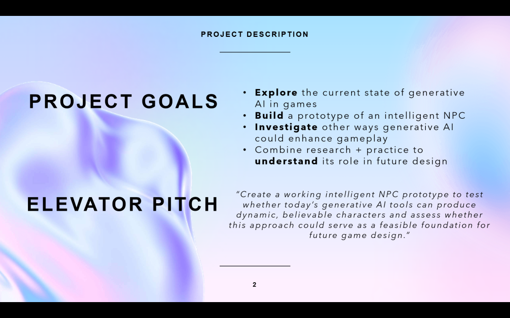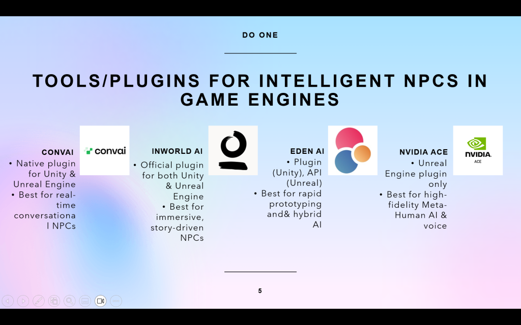- Research current tools of implementing generative AI into game engines.
