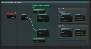 - The interactable objects (my “lever” and cube) light up when the player trace-camera detects that they are in range and able to be interacted with.