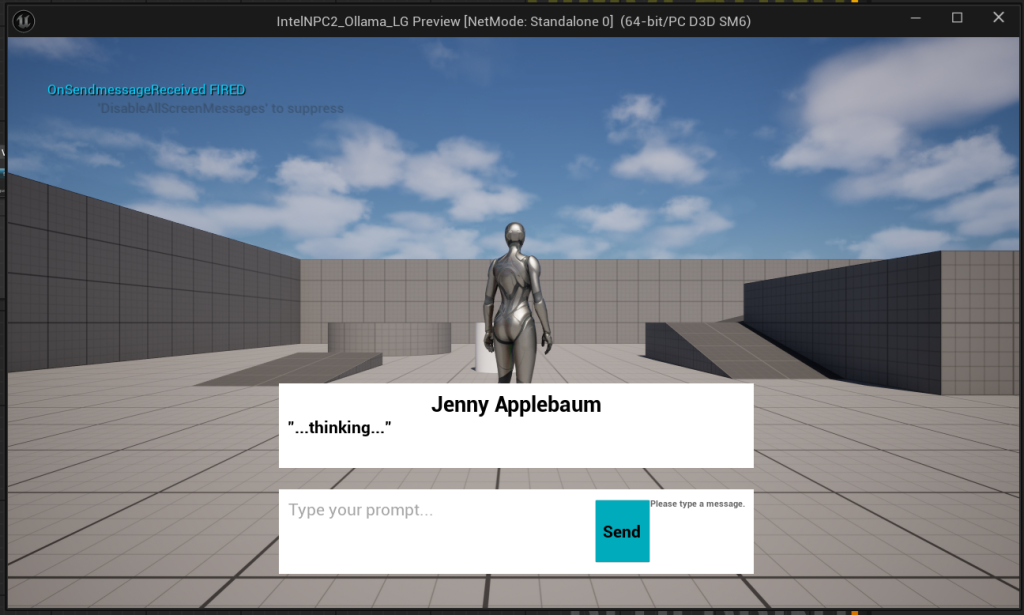Ensured that a system message is automatically added at the start of each chat seeding the NPC’s personality (“Jenny Applebaum, the apple seller”) to shape tone and context.
