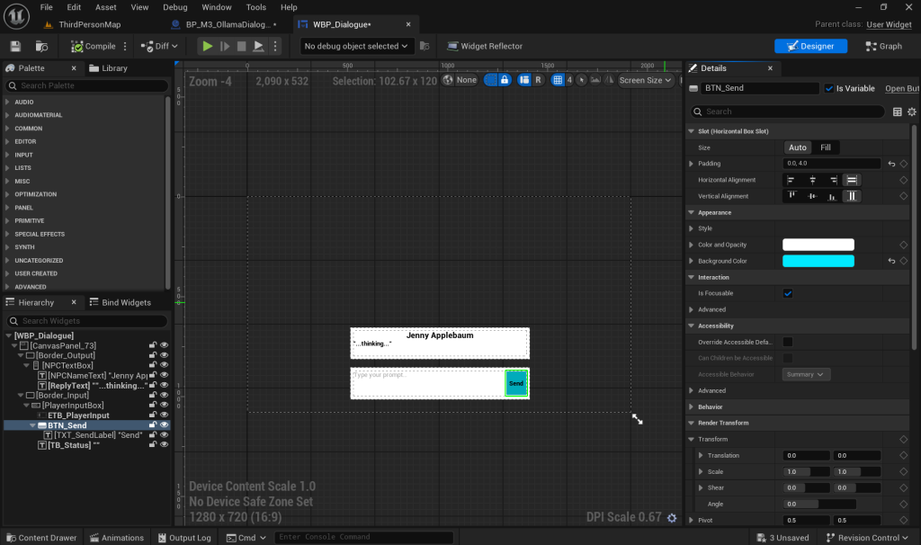 All I needed to do next was build a Dialogue UI Widget with Interactive Player Input, add Stability Guards, and Seed the Apple-Seller’s Personality.