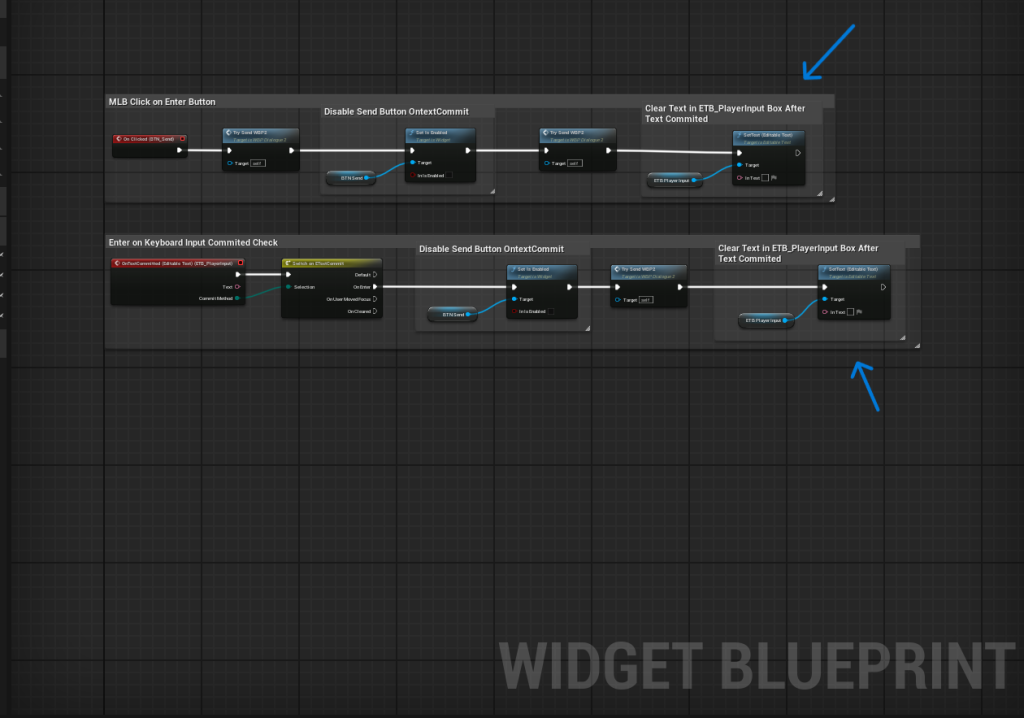 In the documentation, I found a node called SetText (EditableText) and added it to the end of my Widget Blueprint’s Event Graph chain. I left the InText pin blank (so it would clear the text) and set the Target to = the Player Input Box.