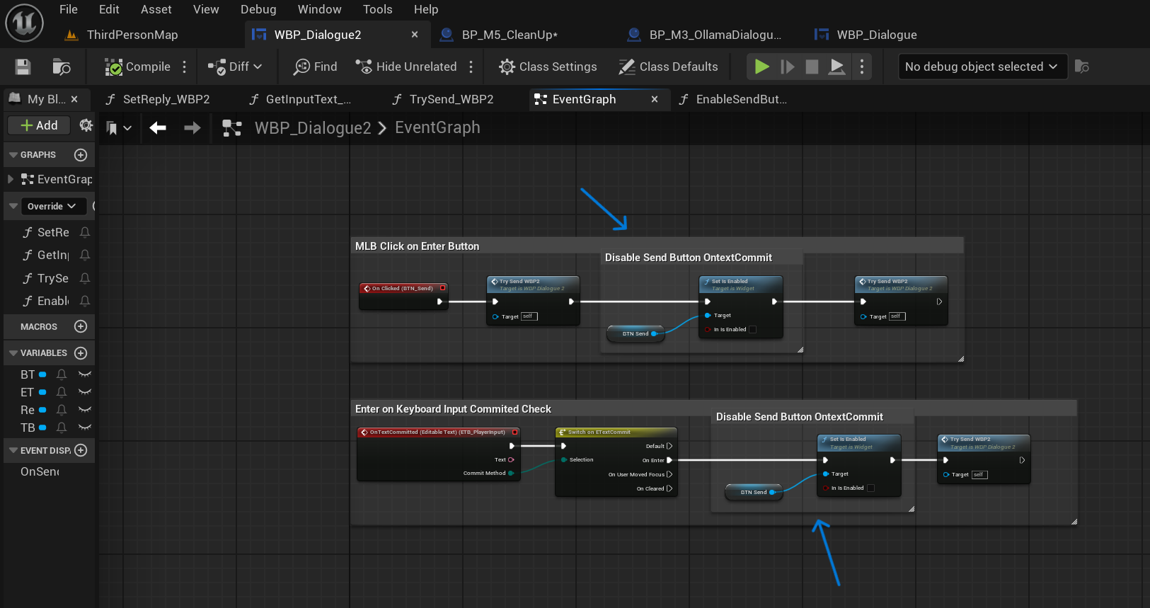 So how to do this? I needed the button to disable after the player committed their input and re-enable once the LLM’s output returned.