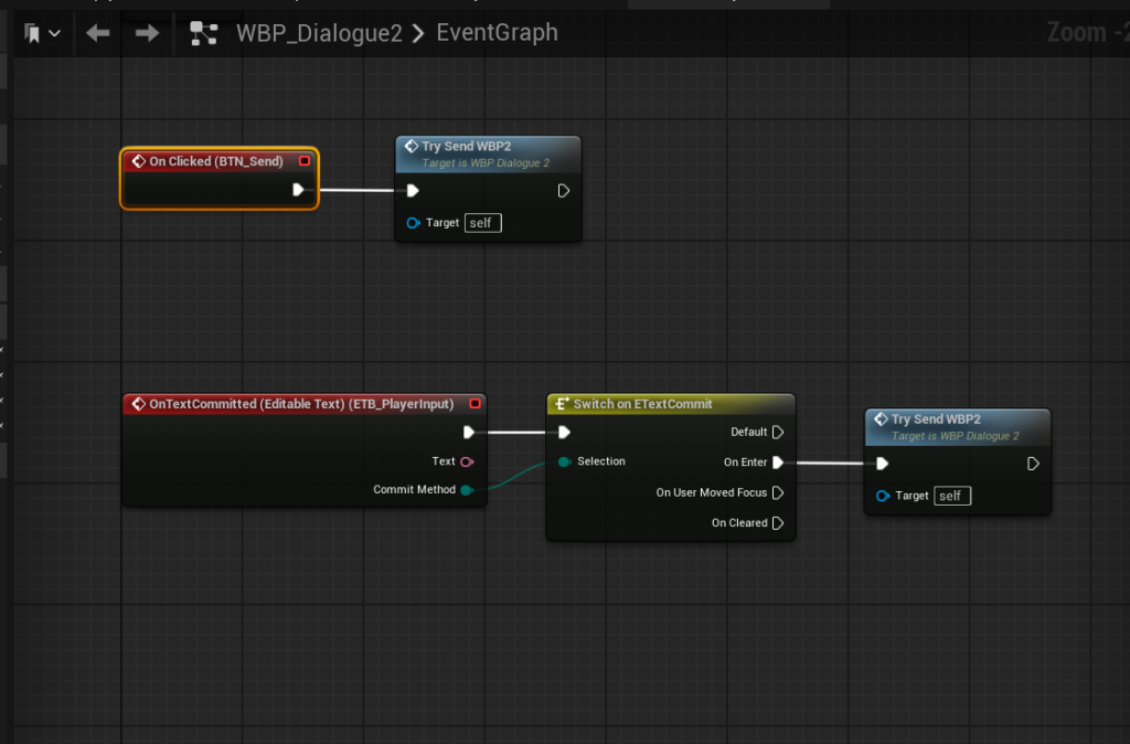 My Widget Blueprint’s Event Graph only had one event OnClicked which worked fine but was tied specifically to mouse input. I first tried wiring in an Equals (==) Commit Method (Enter) node there, but it didn’t quite fit and felt off.