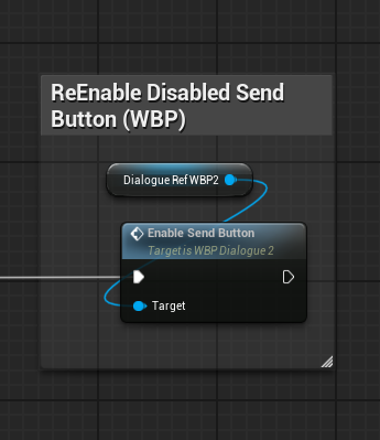 All that was left was re-enabling it again. I added a small custom function to check whether the Send button was enabled, then called it at the end of my main Blueprint after the entire input/output chain ran. It worked. Beautifully!